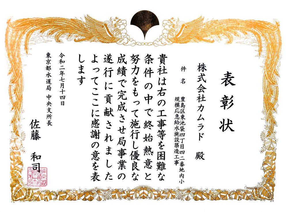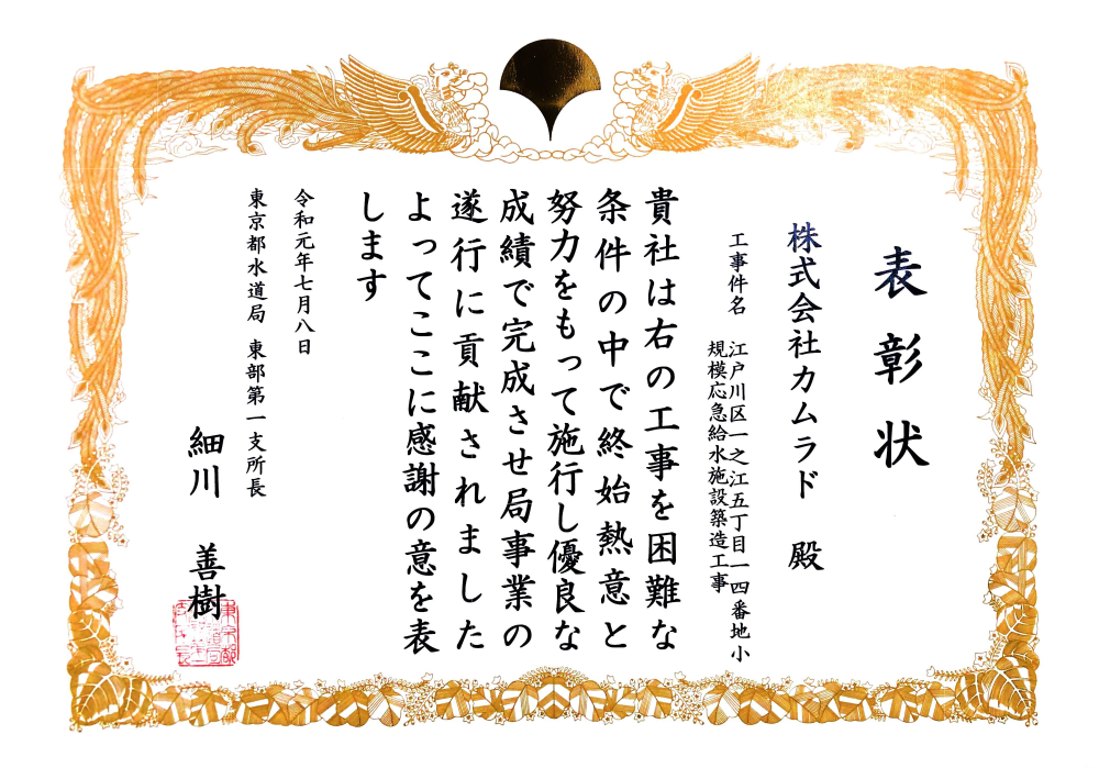 東京都水道局より表彰されました。
